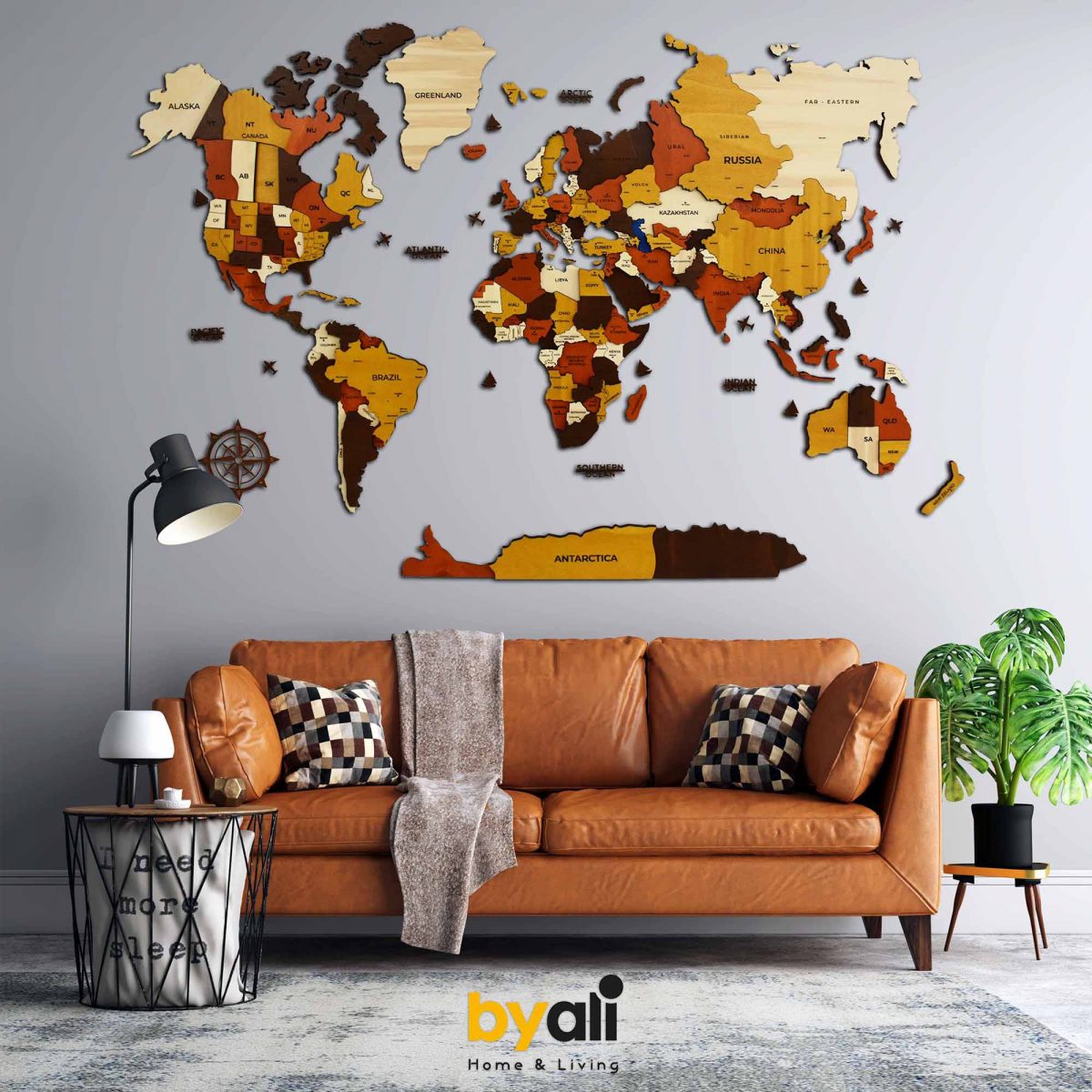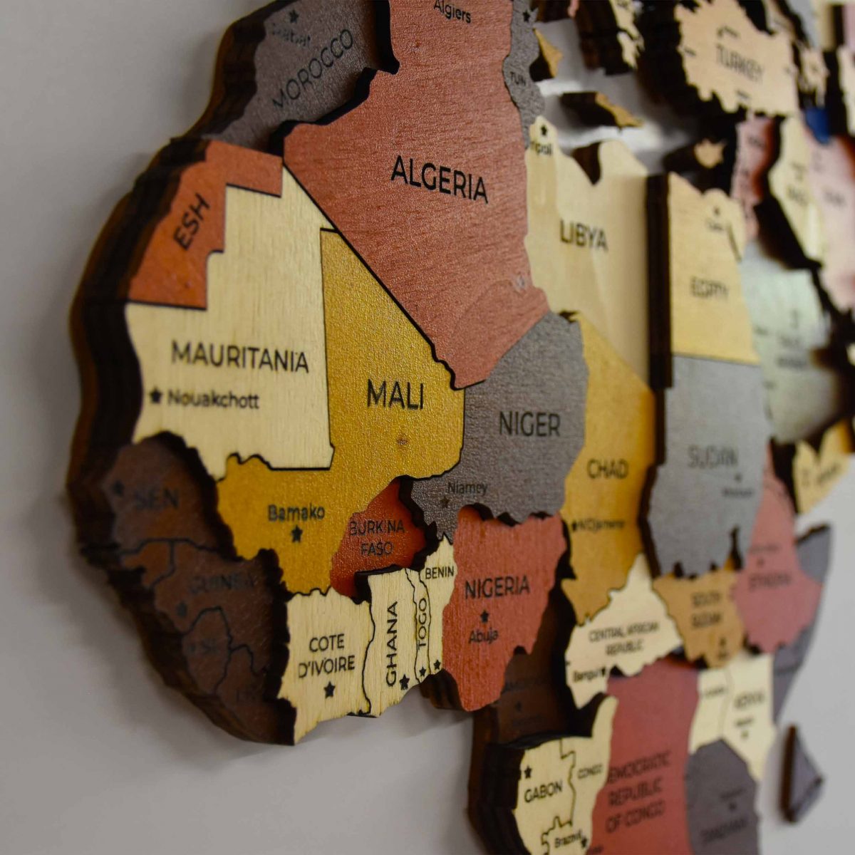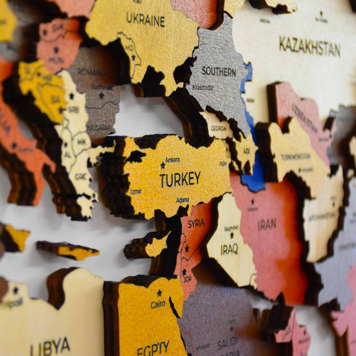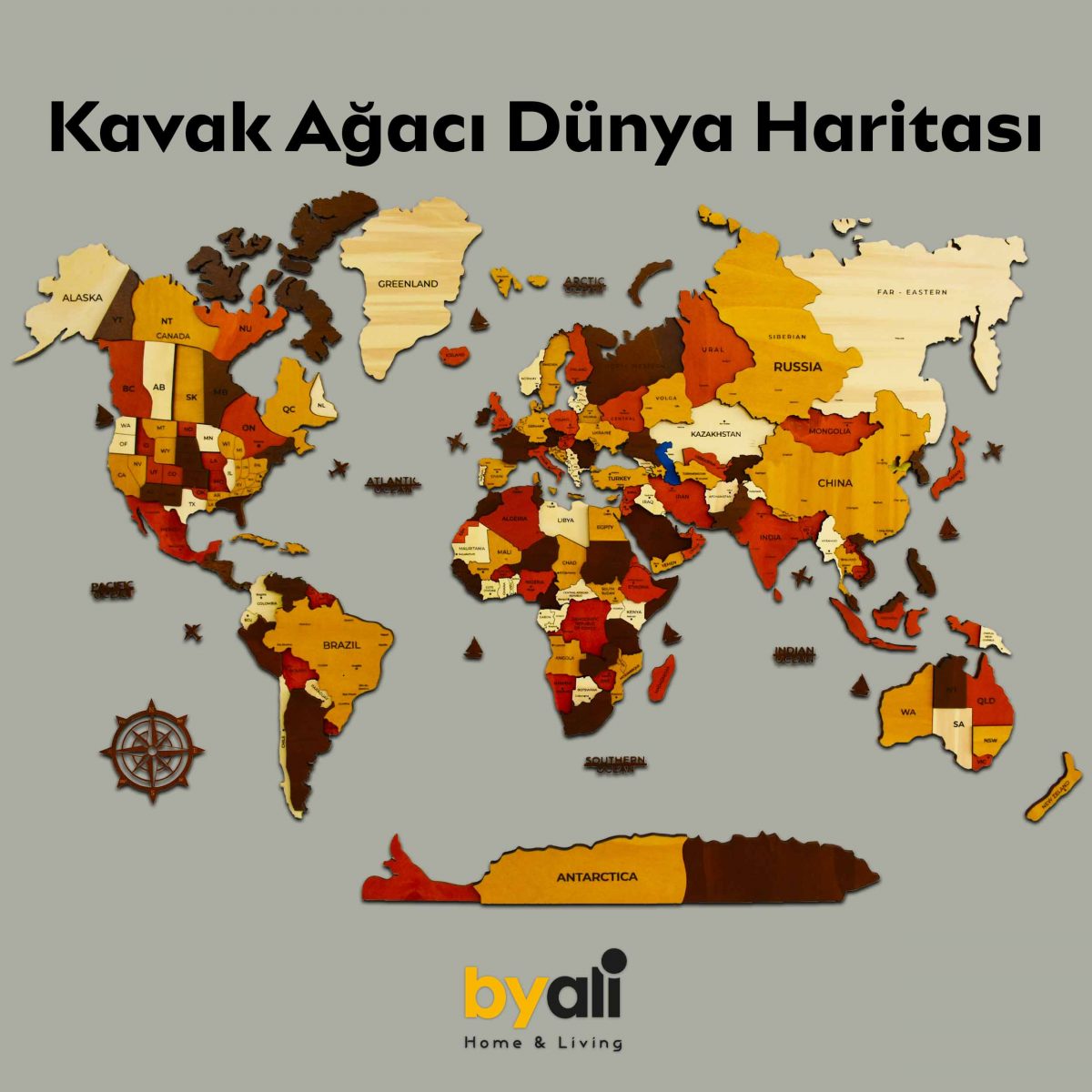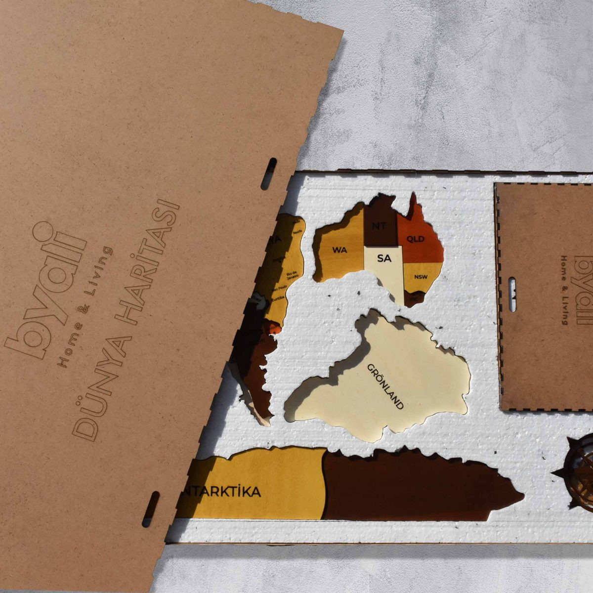 - 3 Katmandan ve 4 renkten oluşan ahşap dünya haritası.