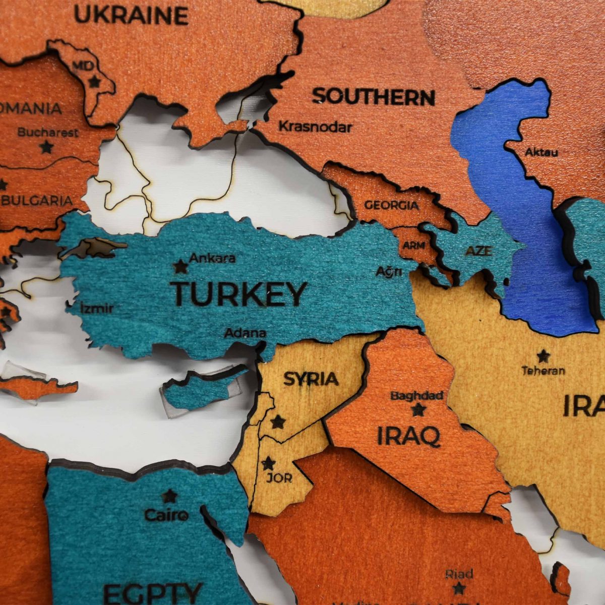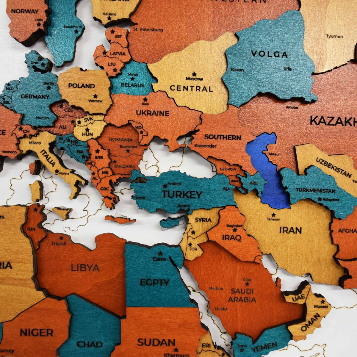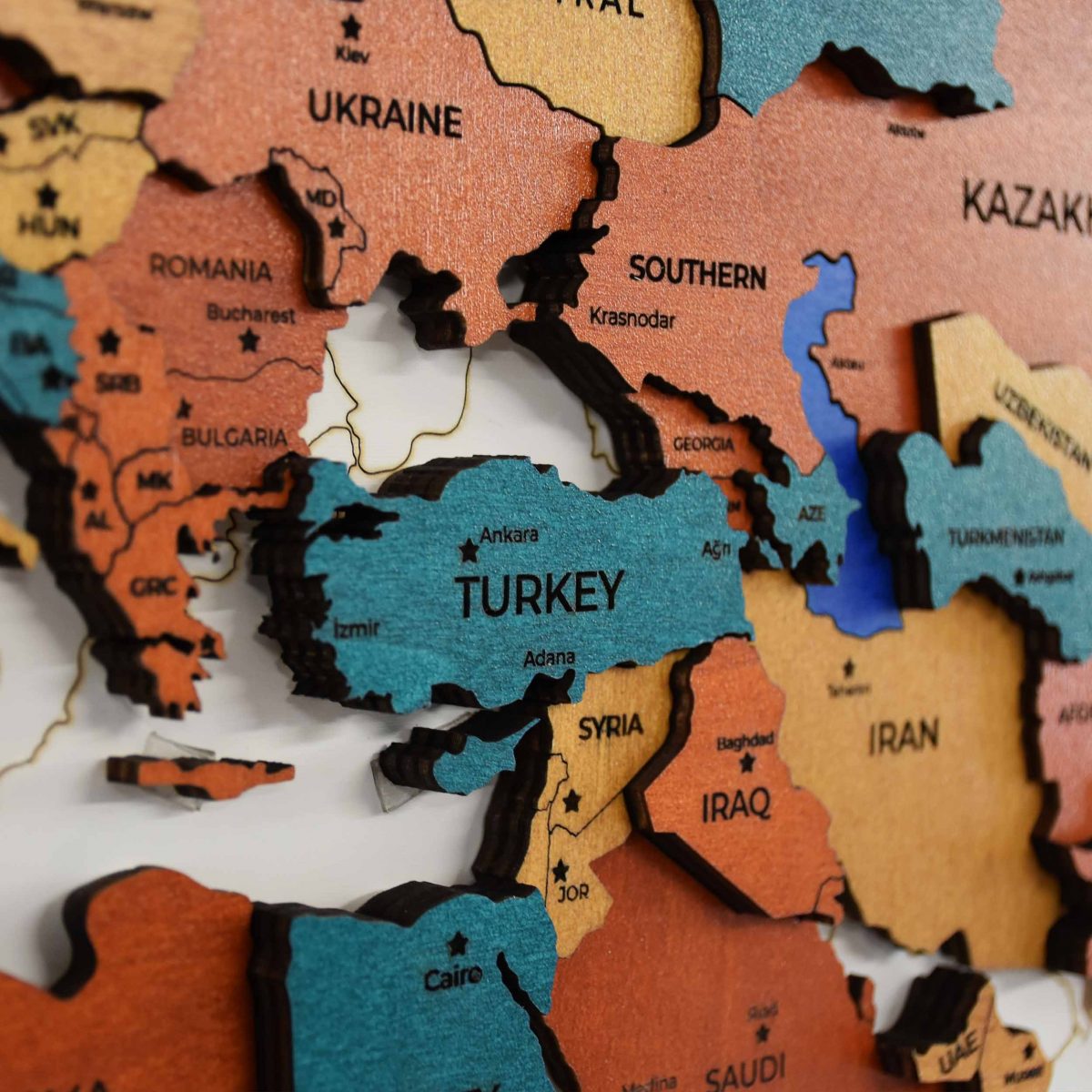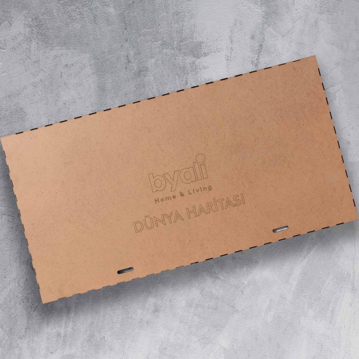 - 3 Katmandan ve 3 renkten oluşan ahşap dünya haritası.