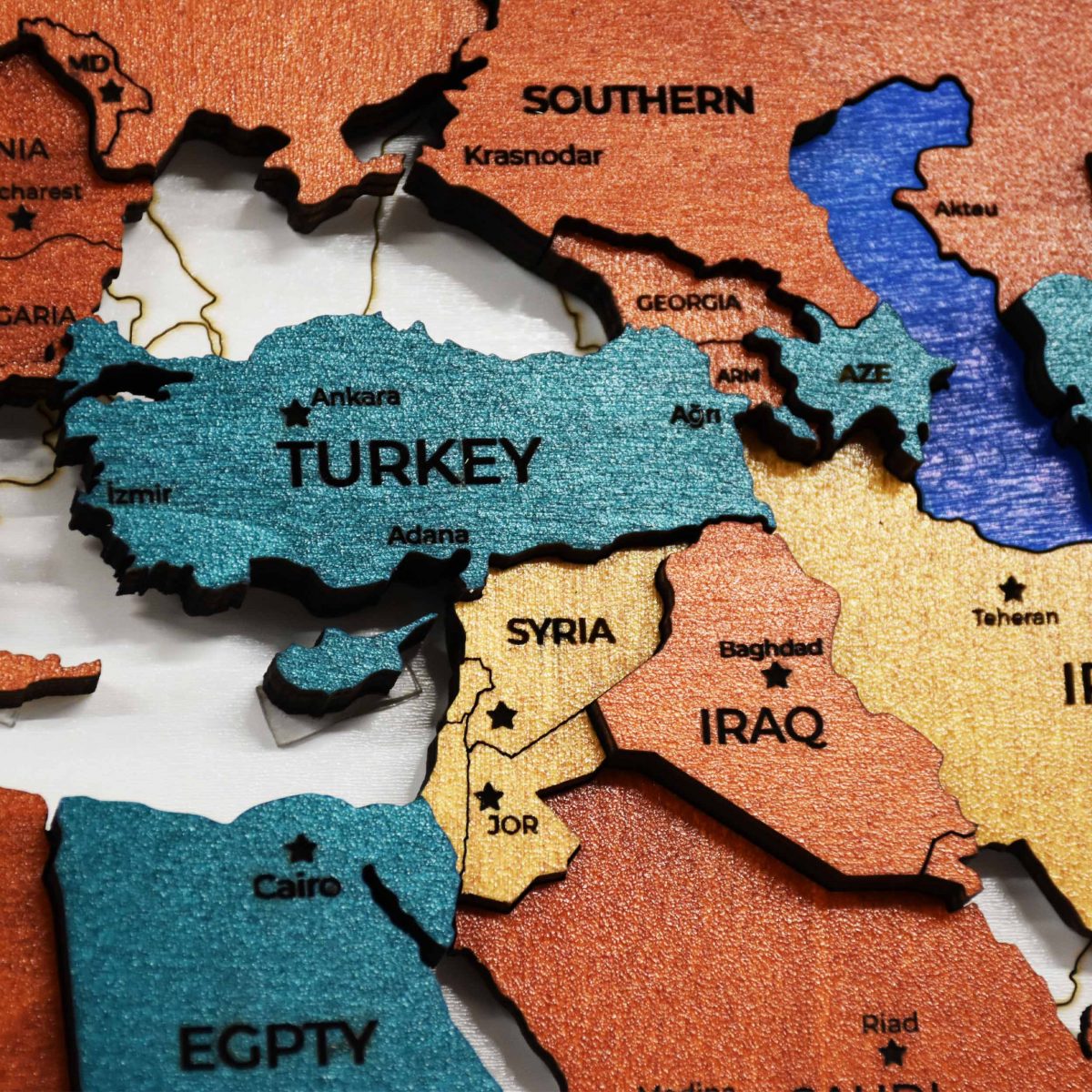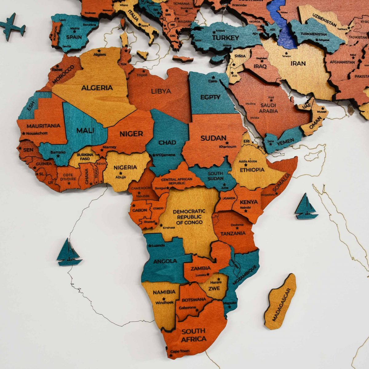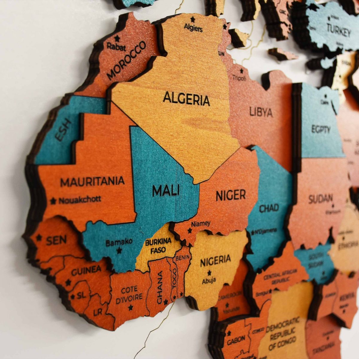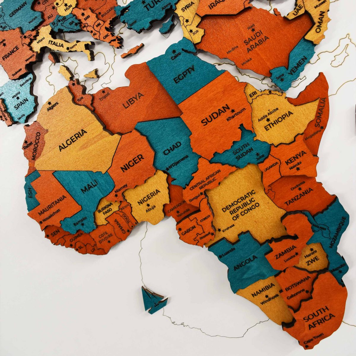 - 3 Katmandan ve 3 renkten oluşan ahşap dünya haritası.