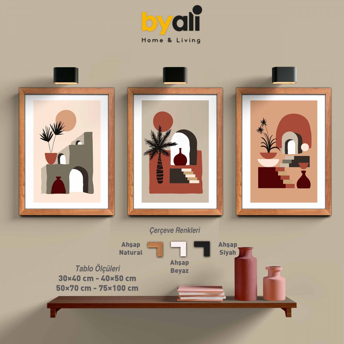 Minimalist Bohemian Ahşap Çerçeveli 3’lü Tablo Seti 3150