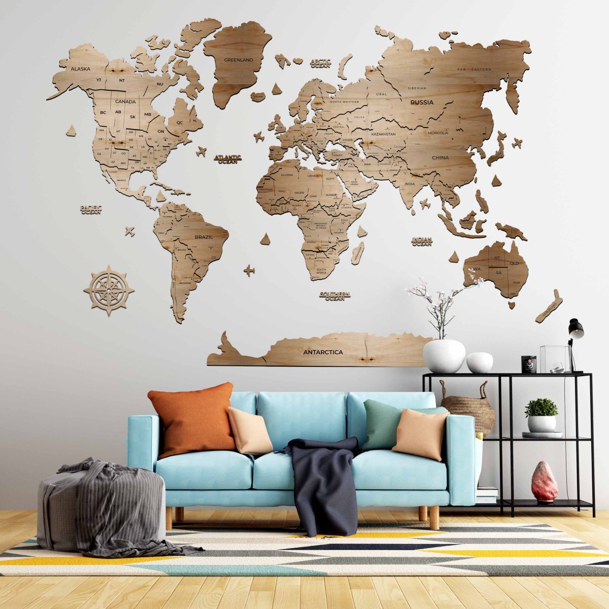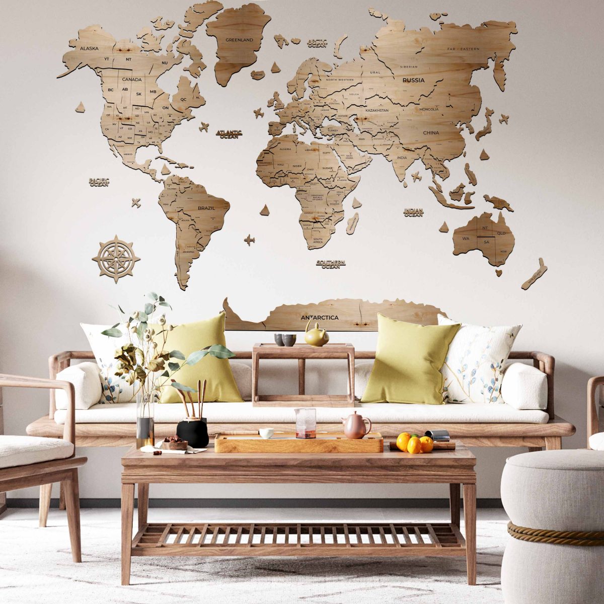 - 3 Katmandan ve Doğal Ahşap renkten oluşan ahşap dünya haritası.